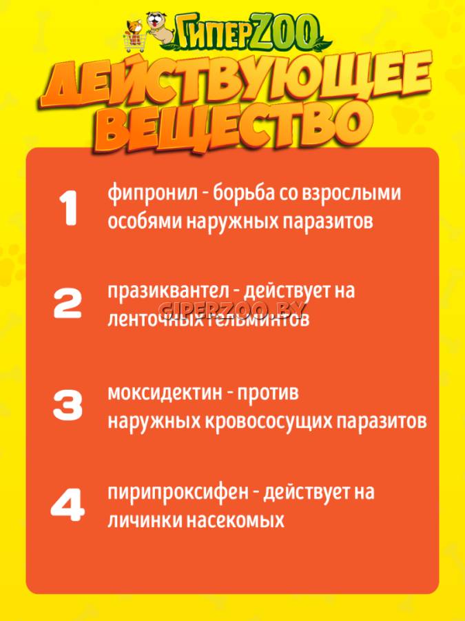 фипронил — 10%, празиквантел 4%, пирипроксифен 2 %, моксидектин 1%