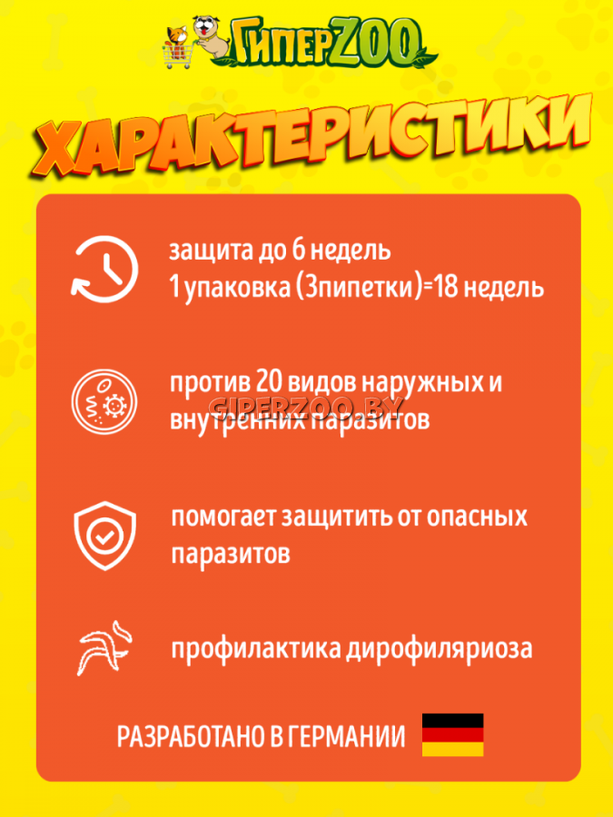 Эффективно защищает от паразитов: - клещей 1 месяц - насекомых 1,5 месяц - гельминтов 1 месяц