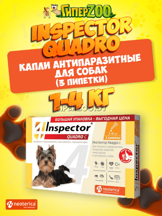Описание Inspector Quadro — Один от всех! Наши cобаки находятся под постоянной угрозой заражения паразитами: клещами, блохами, власоедами и гельминтами. Inspector защищает от 20 видов внешних и внутренних паразитов. Inspector — это инсектоакарицид и антигельминтик.