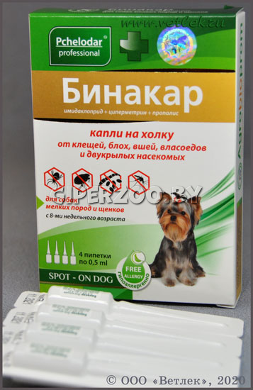 Бинакар (Binakar) - лекарственное средство, содержащее в качестве действующих веществ: имидаклоприд – 80 мг/мл, циперметрин - 3 мг/мл, экстракт прополиса – 5 мг/мл и вспомогательные компоненты.