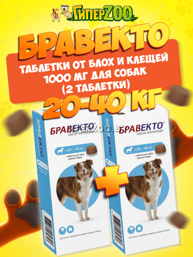 Бравекто таблетка от блох и клещей для собак 20-40 кг, 2 уп.