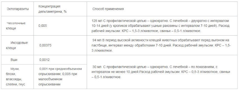 Чесоточные клещи Приготовление 0,125 % водной эмульсии. С профилактической целью – однократно. С лечебной – двукратно с интервалом 10-14 дней (у кроликов обрабатывают ушные раковины с интервалом 7-10 дней). Расход рабочей эмульсии: КРС – 1,5-3 л/животное, свиньи – 0,5-1 л/животное.