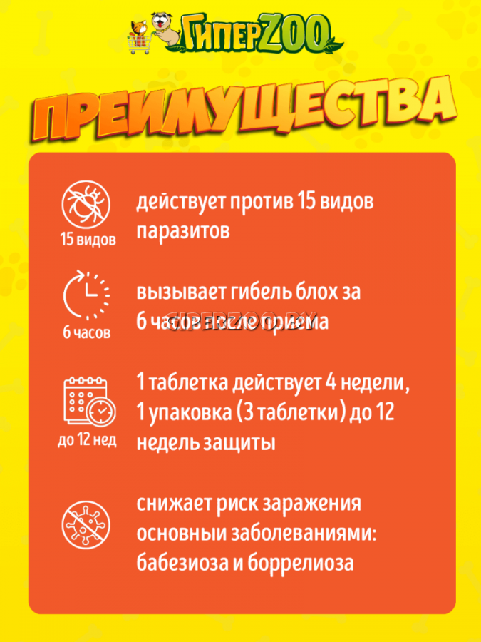 Ветеринарные врачи отмечают, что таблетки обладают приятным вкусом и с легкостью поедаются питомцем с руки владельца. Отсутствует необходимость маскировки препарата небольшом количестве лакомства или корма.