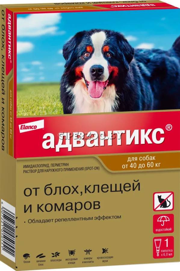 Elanco Адвантикс капли на холку для собак 40-60 кг, 1 пип 6 мл – препарат от компании Elanco, помогает защитить собаку до укуса от самых распространенных представителей рода иксодовых клещей в России, от блох и назойливых комаров, москитов и мух – переносчиков опасных заболеваний, а также аллергических реакций на их укус.