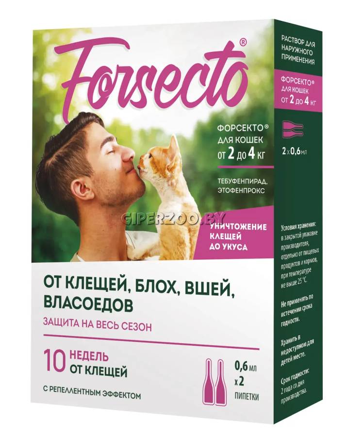 В качестве действующих веществ препарат содержит тебуфенпирад и этофенпрокс. В качестве вспомогательных веществ: повидон, отдушку, бензиловый спирт, моноэтиловый эфир диэтиленгликоля, бутилгидрокситолуол, бутилгидроксианизол. Форма выпуска Раствор для наружного применения. Фасовка Лекарственный препарат выпускают расфасованным по 0,6 мл FORSECTO для кошек от 2 до 4 кг в пипетки из комбинированных материалов, которые упаковывают по 2 штуки в блистер, снабженный вкладышем и помещают в картонные пачки вместе с инструкцией по применению.