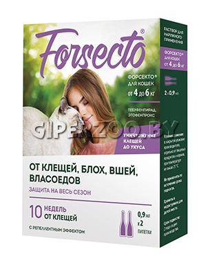 В качестве действующих веществ препарат содержит тебуфенпирад и этофенпрокс. В качестве вспомогательных веществ: повидон, отдушку, бензиловый спирт, моноэтиловый эфир диэтиленгликоля, бутилгидрокситолуол, бутилгидроксианизол. Форма выпуска Раствор для наружного применения. Фасовка Лекарственный препарат выпускают расфасованным по 0,9 мл FORSECTO для кошек от 4 до 6 кг в пипетки из комбинированных материалов, которые упаковывают по 2 штуки в блистер, снабженный вкладышем и помещают в картонные пачки вместе с инструкцией по применению.