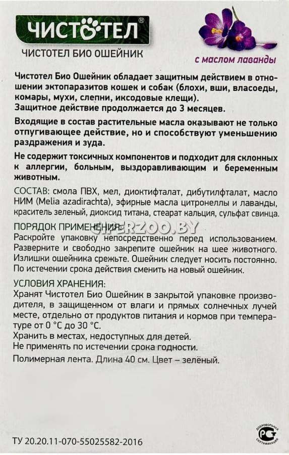 Чистотел БИО Ошейник для кошек и собак с лавандой предназначен для применения взрослым кошкам и собакам, котятам и щенкам с 4-недельного возраста для защиты от эктопаразитов (блохи, вши, власоеды, комары, мухи, слепни, иксодовые клещи). Защитное действие продолжается до 3 месяцев. Входящие в состав эфирные масла оказывают не только отпугивающее действие, но и способствуют уменьшению раздражения и зуда. Не содержит токсичных компонентов и подходит для склонных к аллергии, больных, выздоравливающих и беременных животных.
