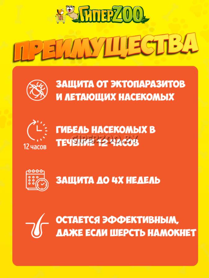 Действует против всех основных наружных паразитов: блох, иксодовых клещей, а также на широкий спектр летающих насекомых