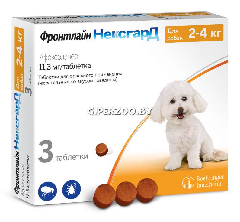 Фронтлайн НексгарД выпускают в четырех дозировках: таблетки массой 0,5 г; 1,25 г; 3,0 г; и 6,0 г, содержащие в качестве действующего вещества 2,27% афоксоланера (соответственно 11,3 мг; 28,3 мг; 68 мг и 136 мг в таблетке), а также вспомогательные вещества: кукурузный крахмал – 25%, муку из соевого белка – 20%, добавку с ароматом и вкусом тушеной говядины – 20%, повидон К30 – 2,7%, макрогол 400 – 7,1%, макрогол 4000 – 6,3%, макрогол 15 гидроксистеарат – 3,1%, глицерол – 10%, триглицерид средней степени – 3,1%, сорбат калия – 0,3%.