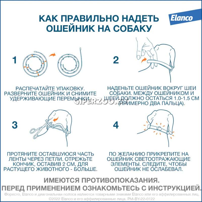 После вскрытия упаковки ошейник разворачивают, с внутренней стороны удаляют пластиковые перемычки и одевают на животное, подгоняя по размеру так, чтобы между шеей животного и ошейником оставался промежуток в 1,0–1,5 см, затем пропускают свободный конец ленты через петли и излишек срезают. После этого к ошейнику можно прикрепить три светоотражательные клипсы, которые помогают следить за животным в темноте. Необходимо вытащить клипсы из пакета, распределить их равномерно на неперекрывающейся части ошейника, чтобы они не мешали снятию ошейника и не блокировали механизм быстрого снятия. При надлежащем присоединении клипсы слышен щелчок. Присоединённые к ошейнику клипсы снять невозможно. Непрерывное использование ошейника обеспечивает защиту животных на протяжении 8 месяцев. Форесто ошейник водоустойчив, инсектоакарицидная эффективность сохраняется после мытья и купания животного. Форесто ошейник следует применять до наступления периодов повышенной активности блох и клещей. Симптомов, возникающих при передозировке препарата, не установлено. Форесто ошейник применяется однократно.