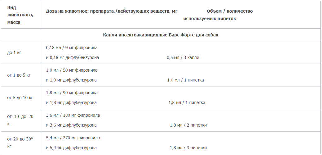 С учетом вида и массы обрабатываемого животного выбирают пипетки-капельницы необходимого объема или их комбинации и применяют препарат в дозах, указанных в таблице.