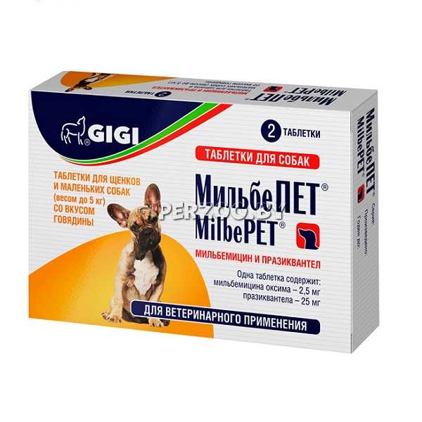 «МильбеПЕТ таблетки для щенков и маленьких собак» (весом до 5 кг) — продолговатые, овальные таблетки, с разделительной бороздкой посередине на одной из сторон, от белого до бежевого цвета, с легким запахом, характерным для говядины, содержат в качестве действующих веществ мильбемицина оксим 2,5 мг/табл. и празиквантел 25 мг/табл.