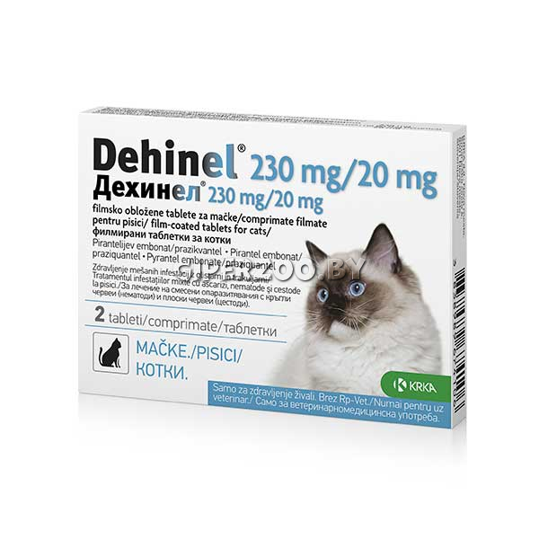 Таблетки Дехинел для кошек относятся к группе комбинированных антигельминтных препаратов. Препарат обладает широким спектром антигельминтного действия на круглых и ленточных гельминтов, паразитирующих у кошек, в том числе Тохосага cati (syn. mystax), Toxascaris leonina, Ancylostoma tubaeforme, Ancylostoma braziliense, Echinocoecus multilocularis, Dipylidium caninum, Hydatigera (Taenia) taeniaeformis, Mesocestoides spp., Joyeuxiella pasqualei. Механизм действия празиквантела, входящего в состав препарата, заключается в деполяризации нейромышечных ганглиоблокаторов, нарушении транспорта глюкозы и микротурбулярной функции у цестод, что приводит к нарушению мышечной иннервации, параличу и гибели паразита. Празиквантел быстро всасывается в кишечнике распределяется во внутренних органах и тканях; выводится из организма с мочой в основном в метаболизированной форме. Пирантел эмбонат оказывает выраженное нематодоцидное действие, вызывая повышение проницаемости клеточных мембран, необратимый паралич и контрактуру мышц у нематод, что приводит к гибели паразита и способствует его элиминации из желудочно-кишечного тракта. Пирантел эмбонат частично всасывается в кишечнике, быстро метаболизируется и выводится из организма в основном с фекалиями. Препарат по степени воздействия на организм относится к малоопасным веществам (4 класс опасности по ГОСТ 12.1.007-76), в рекомендуемых дозах не оказывает эмбриотоксического, тератогенного и сенсбилизирующего действия. Хорошо переносится кошками разных пород и возраста.