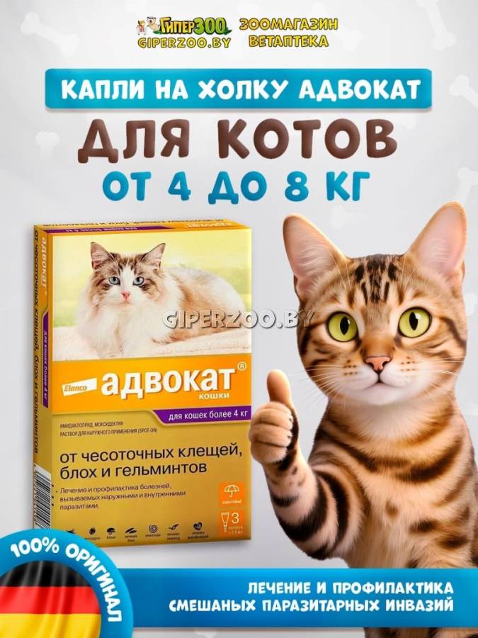Elanco Адвокат капли на холку для котов 4-8 кг, 1 пипетка 0,8 мл – комплексный препарат, который помогает защищать вашего питомца от широкого спектра внешних (блох, чесоточных клещей) и внутренних (глистов) паразитов.