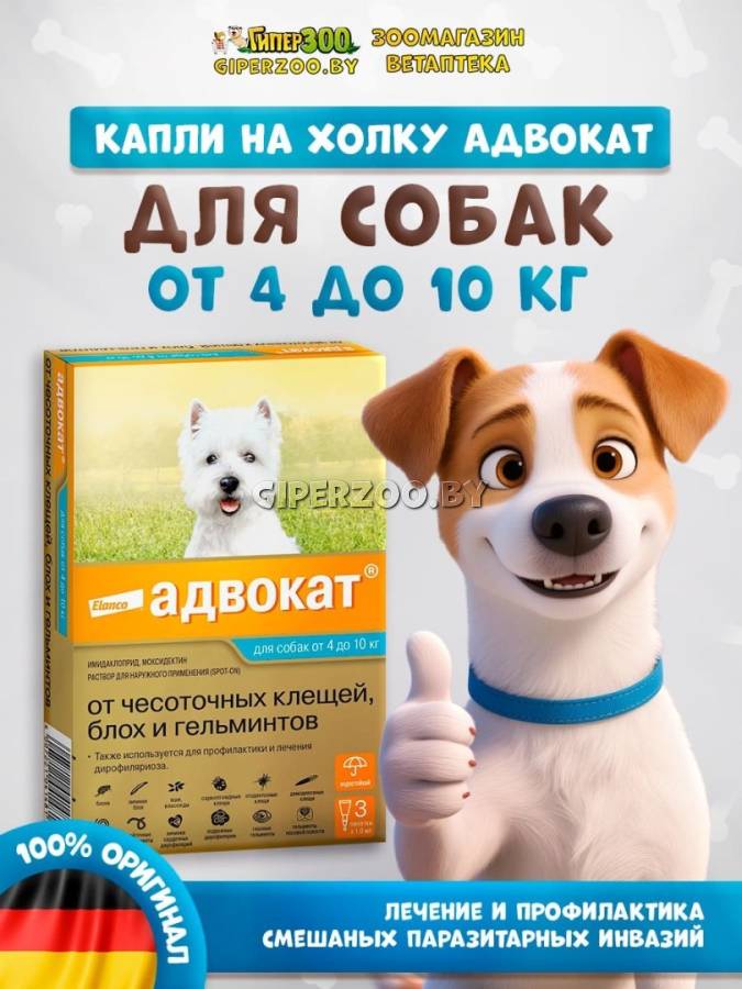 Elanco Адвокат капли на холку для собак 4-10 кг, 1 пипетка 1 мл – комплексный препарат компании Elanco, который помогает защищать вашего питомца от широкого спектра внешних (блох, вшей, власоедов, чесоточных клещей) и внутренних (глистов) паразитов. Адвокат прост в применении – капли наносятся на холку в дозировке согласно весу собаки.