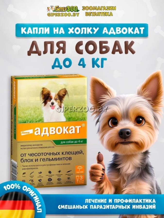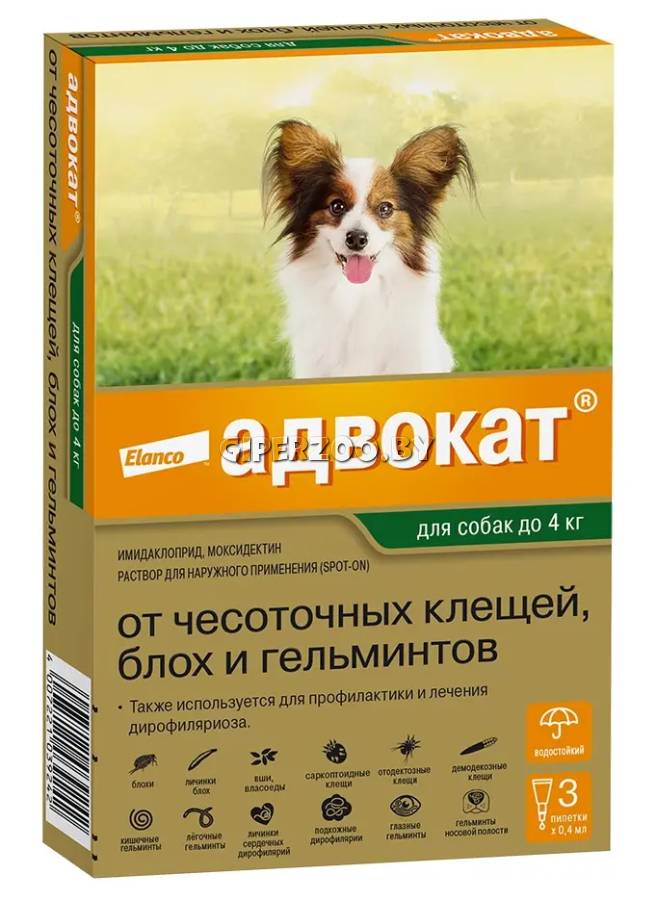 Elanco Адвокат капли на холку для собак до 4 кг, 1 пипетка 0,4 мл – комплексный препарат, который помогает защищать вашего питомца от широкого спектра внешних (блох, вшей, власоедов, чесоточных клещей) и внутренних (глистов) паразитов. Адвокат прост в применении – капли наносятся на холку в дозировке согласно весу собаки.