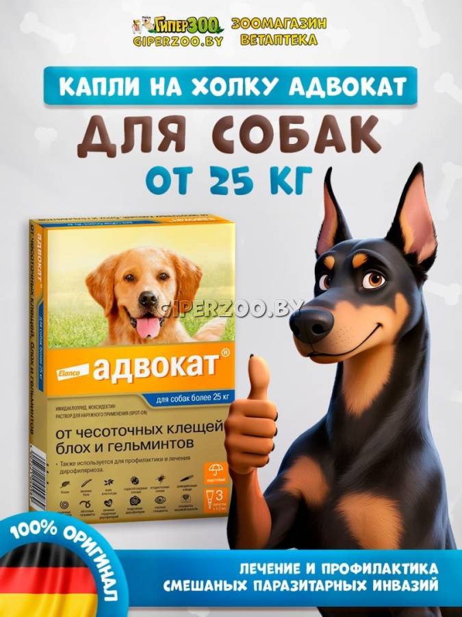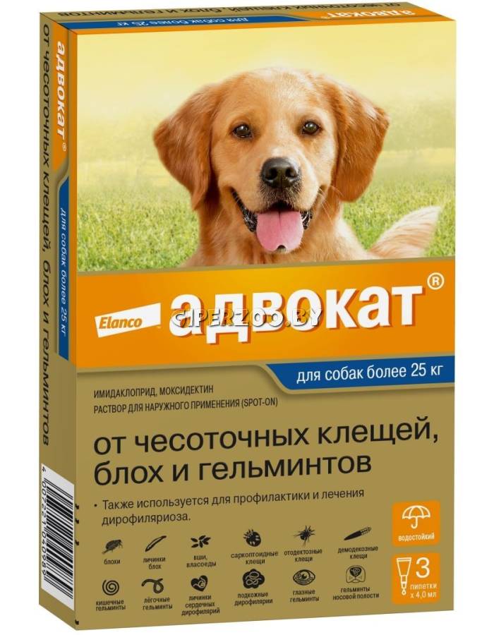 Elanco Адвокат капли на холку для собак от 25 кг, 1 пипетка 4 мл – комплексный препарат, который помогает защищать вашего питомца от широкого спектра внешних (блох, вшей, власоедов, чесоточных клещей) и внутренних (глистов) паразитов. Адвокат прост в применении – капли наносятся на холку в дозировке согласно весу собаки.