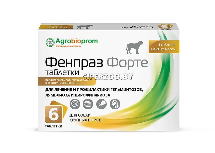 Фенпраз форте таблетки для крупных пород собак и щенков, 6 таб – лекарственный препарат Фенпраз Форте таблетки содержит в качестве действующих веществ пирантела памоат, празиквантел, фебантел и ивермектин.Лекарственный препарат Фенпраз Форте таблетки выпускают расфасованным по 2, 6, 10 и 50 таблеток в блистеры (контурную ячейковую упаковку из полимерных материалов и фольги алюминиевой) или в полимерные банки (флаконы), герметично укупоренные навинчиваемыми крышками с контролем первого вскрытия, упакованные в картонные пачки. Каждую потребительскую упаковку снабжают инструкцией по применению и стикерами для ветеринарного паспорта.