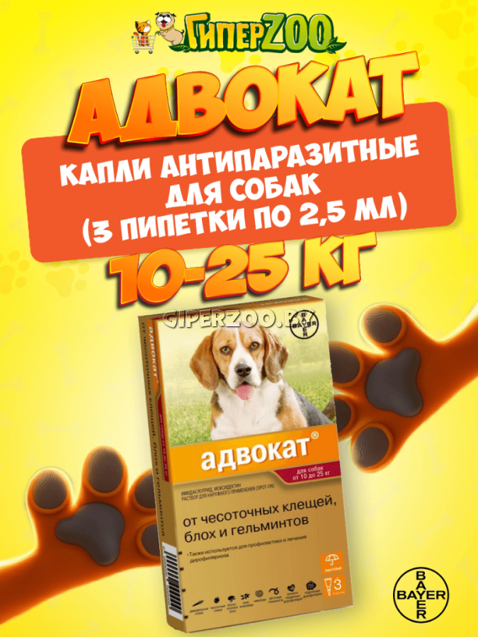 Bayer Адвокат капли на холку для собак 10-25 кг, 3 пипетки по 2,5 мл