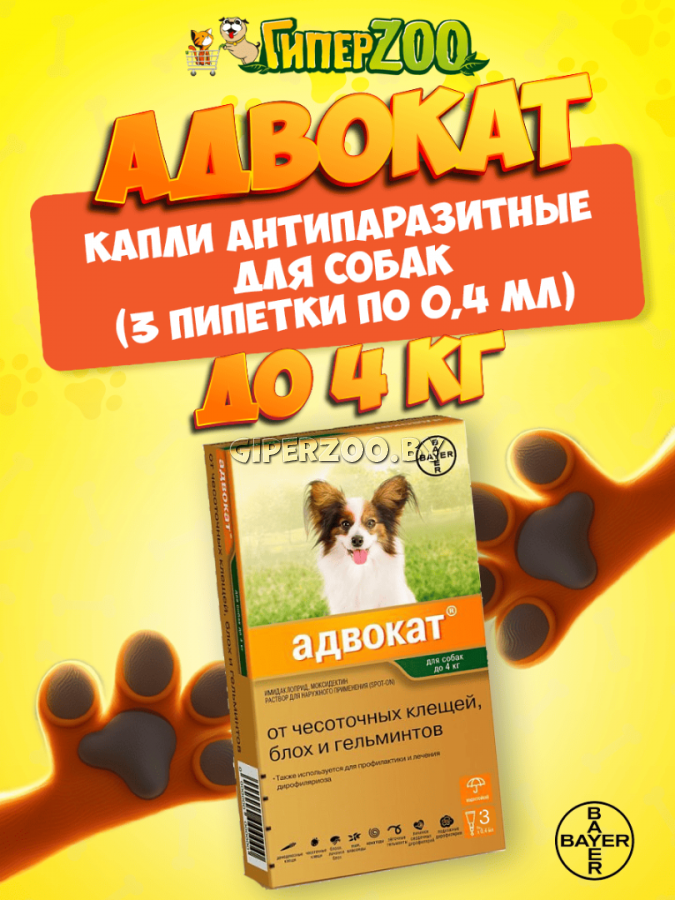 Адвокат® – комбинированный противопаразитарный лекарственный препарат. В 1 мл препарата содержится имидаклоприд – 100 мг и моксидектин – 25 мг. Адвокат® выпускается в виде капель на холку в четырех дозировках – для щенков и собак до 4 кг, для собак 4–10кг, для собак 10–25кг и для собак более 25кг.
