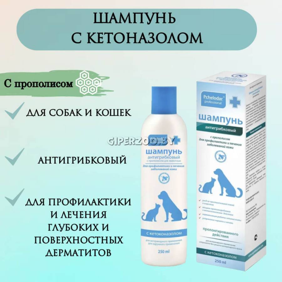 Шампунь Антигрибковый с кетононазолом, пироктон оламином и экстрактом прополиса предназначен для профилактики и лечения заболеваний кожи животных. Кетоконазол и пироктон оламин оказывают длительное противогрибковое и противобактериальное действие, активен в отношении микроорганизмов (Trichophyton mentagrophytes, Trichophyton rubrum, Trichophyton verrucosum, Microsporum canis, Microsporum gypseum и других, бактерий E.coli, Salmonella spp., Proteus spp., Klebsiella spp., Enterobacteriacae spp. и Pseudomonas aeruginosa), дрожжей (Candida spp., и Malassezia spp.,) и диморфных грибов. Экстракт прополиса препятствует размножению бактерий, обладает выраженным фунгицидным (противогрибковым), противовоспалительным, противозудным и ранозаживляющим действием.