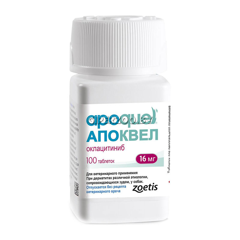 Апоквел выпускают в трех дозировках, содержащих в 1 таблетке в качестве действующего вещества оклацитиниба малеат (в пересчете на оклацитиниб) 3,6 мг; 5,4 мг и 16 мг соответственно, а также вспомогательные вещества: микрокристаллическую целлюлозу, лактозы моногидрат, натрия карбоксиметил-крахмал, магния стеарат, плёнкообразователь «Opadry II White» и воду очищенную.