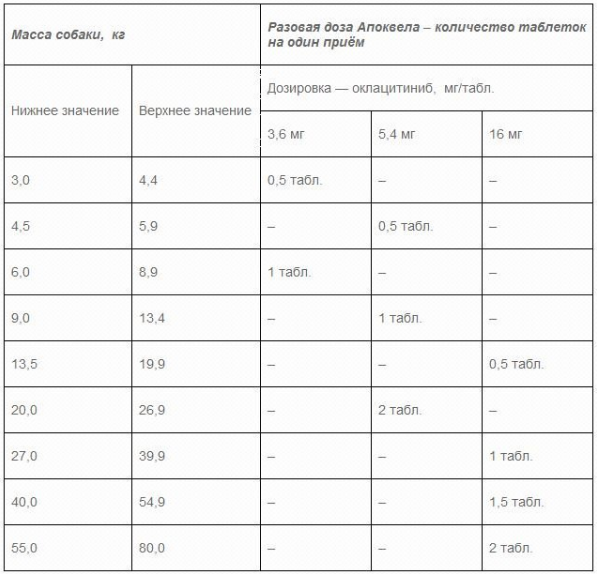 Дозы Апоквела в зависимости от массы животного и используемой дозировки представлены в таблице.