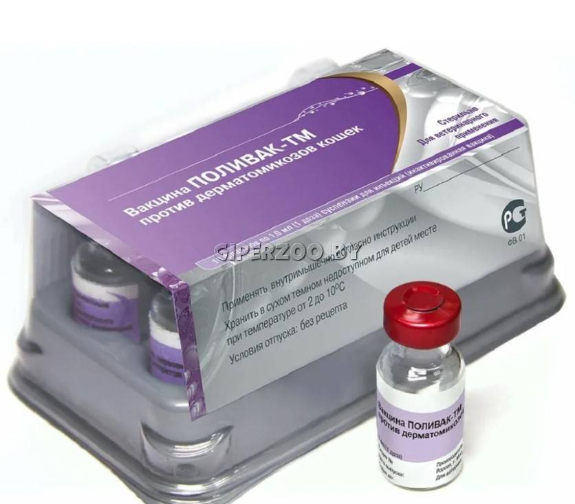 Вакцина Поливак ТМ, 1 доза, 1 мл — ассоциированная инактивированная вакцина против дерматомикозов, включает грибы из рода Trichophyton (стригущий лишай) и Microsporum, является безопасным и высокоэффективным средством специфической профилактики и лечения микроспории и трихофитии у животных семейства кошачьих.