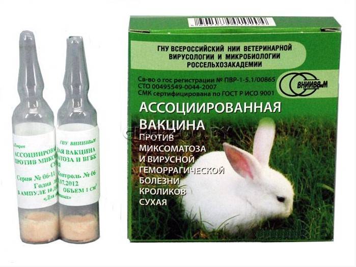 Вакцину ассоциированную против миксоматоза и вирусной геморрагической болезни кроликов изготавливают из штамма В-82 вируса миксомы кроликов и штамма В-87 вируса геморрагической болезни кроликов. Вакцина представляет собой пористую сухую массу от бледно-розового до светло-коричневого цвета. Вакцину расфасовывают по 0,5, 1, 2 см3 в стерильные ампулы вместимостью 2, 3, 5, 6 см3, 4, 6 см3 во флаконы емкостью 10 и 20 см3, содержащие 5-120 иммунизирующих доз. Флаконы закрывают пробками и закатывают алюминиевыми колпачками, а ампулы запаивают. На флакон (ампулу) с вакциной наклеивают этикетку или наносят несмываемой краской маркировку с указанием: краткого наименования организации – изготовителя, краткого названия биопрепарата (вакцина против миксоматоза и ВГБК сухая), номера серии, номера контроля, даты изготовления, количества доз и срока годности. Флаконы (ампулой) с вакциной упаковывают в картонные коробки с перегородками, обеспечивающими неподвижность и целостность флаконов и (ампул). На каждую коробку наклеивают этикетку с указанием : ведомства и наименования предприятия – изготовителя, его товарного знака, наименования биопрепарата, номера серии, номера контроля, даты изготовления ( месяц, год ), срока годности, количества флаконов ( ампул ) в коробке, количества доз во флаконе (ампуле) , условий хранения , обозначения настоящих ТУ и надпись «Для животных». В каждую коробку вкладывают наставление по применению вакцины.