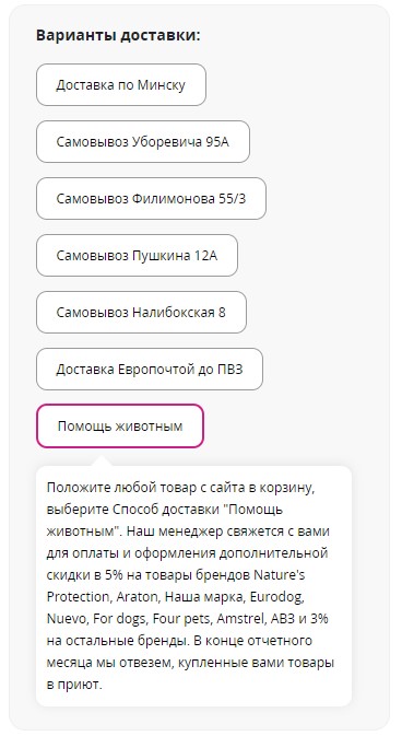 Положите любой товар с сайта в корзину, выберите Способ доставки "Помощь животным".