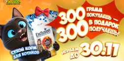 При покупке сухого кошачьего корма Exclusion от 300 грамм — 300 грамм в подарок!