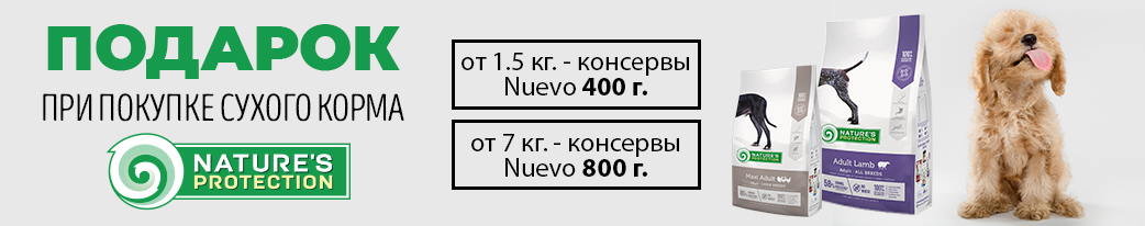 Покупайте сухие корма для собак Nature's Protection и сухие корма для кошек Nature's Protection с доставкой по Минску и Беларуси, забирайте самовывозом в розничных магазинах ГиперZOO и получайте консервы супер-премиум качества NUEVO в подарок к каждому заказу!