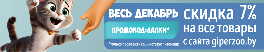Для любимых пушистиков, только при регистрации и активации статуса Питомника через сайт giperzoo.by промокод на 7% на все товары с сайта.